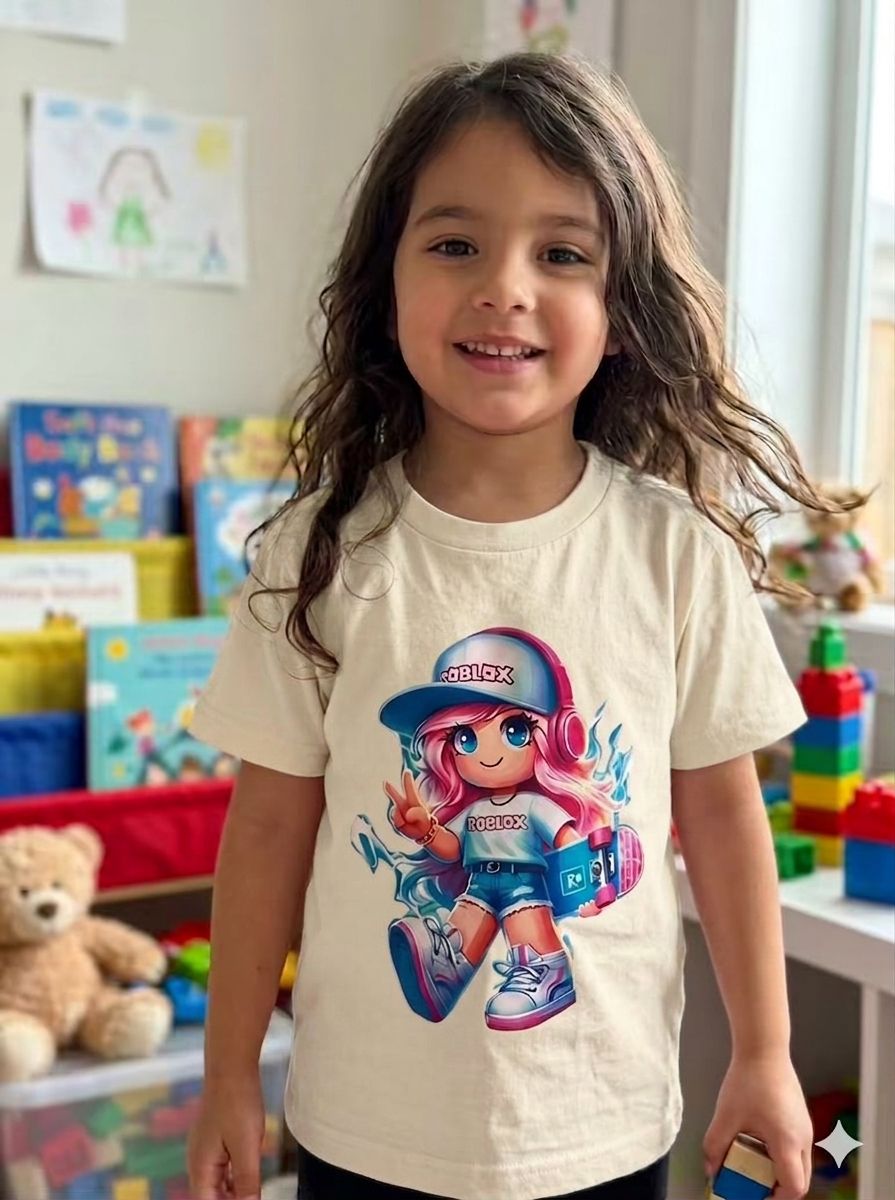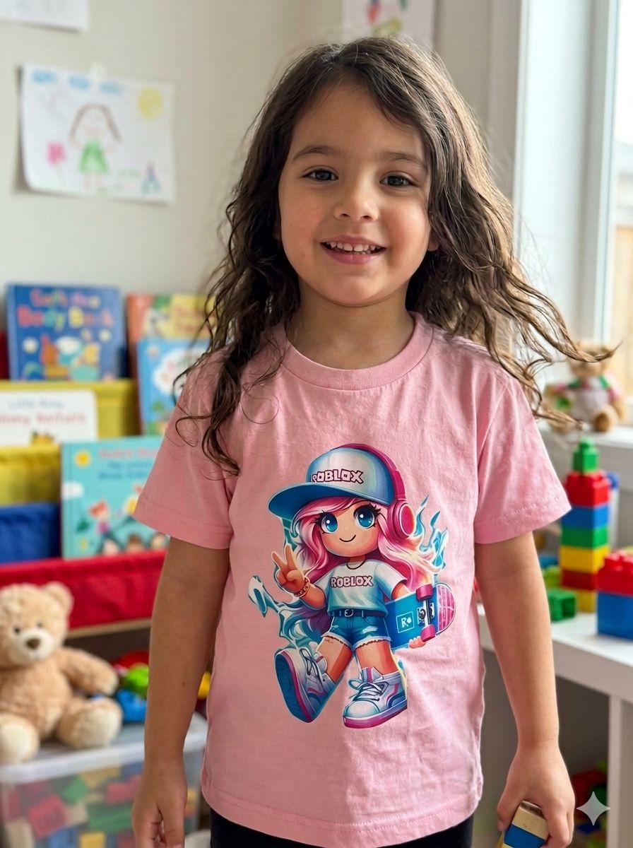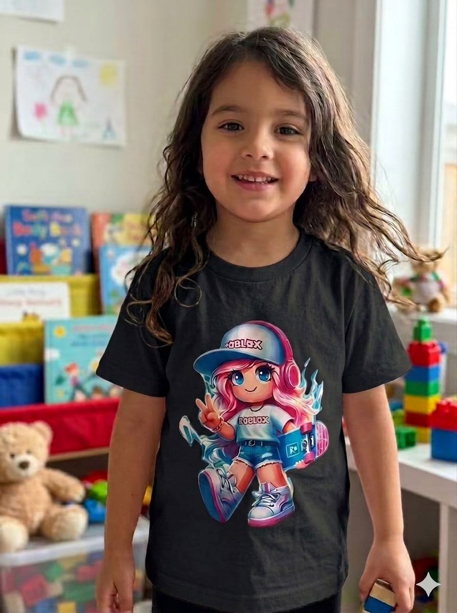 Sua pequena gamer vai adorar vestir o universo de Roblox! Esta camiseta combina o conforto do algodão com uma estampa vibrante e moderna, perfeita para o dia a dia, festas temáticas ou para as horas de diversão no console.