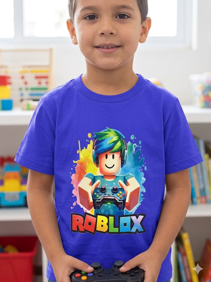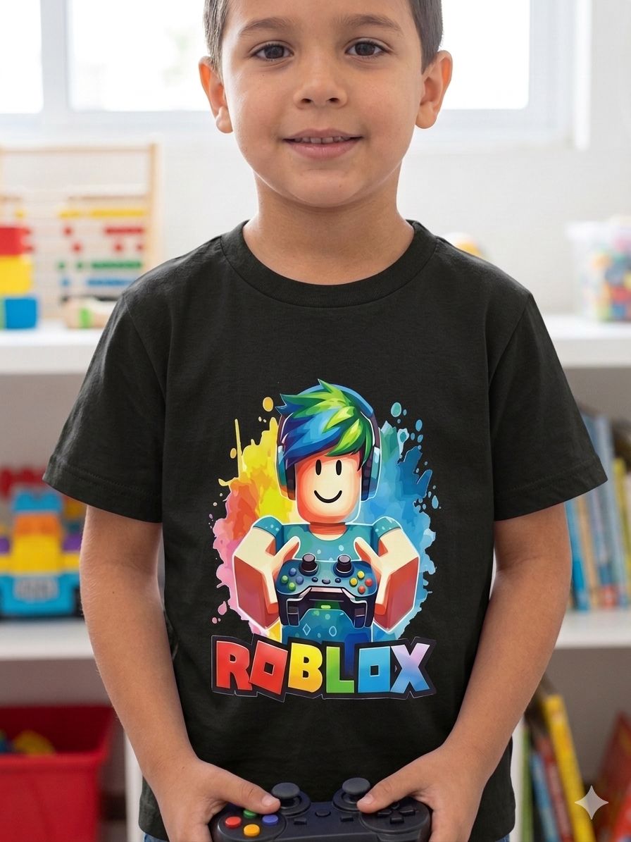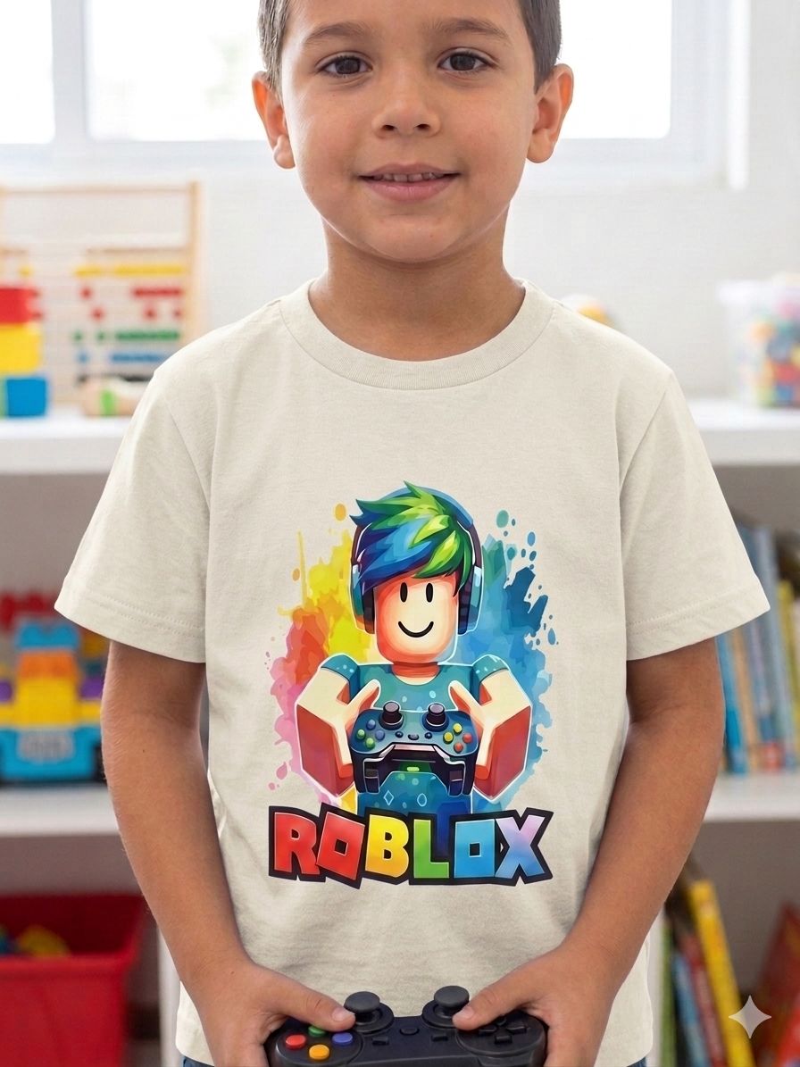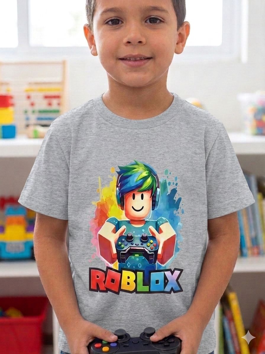 Seu pequeno gamer vai adorar vestir o universo de Roblox! Esta camiseta combina o conforto do algodão com uma estampa vibrante e moderna, perfeita para o dia a dia, festas temáticas ou para as horas de diversão no console.