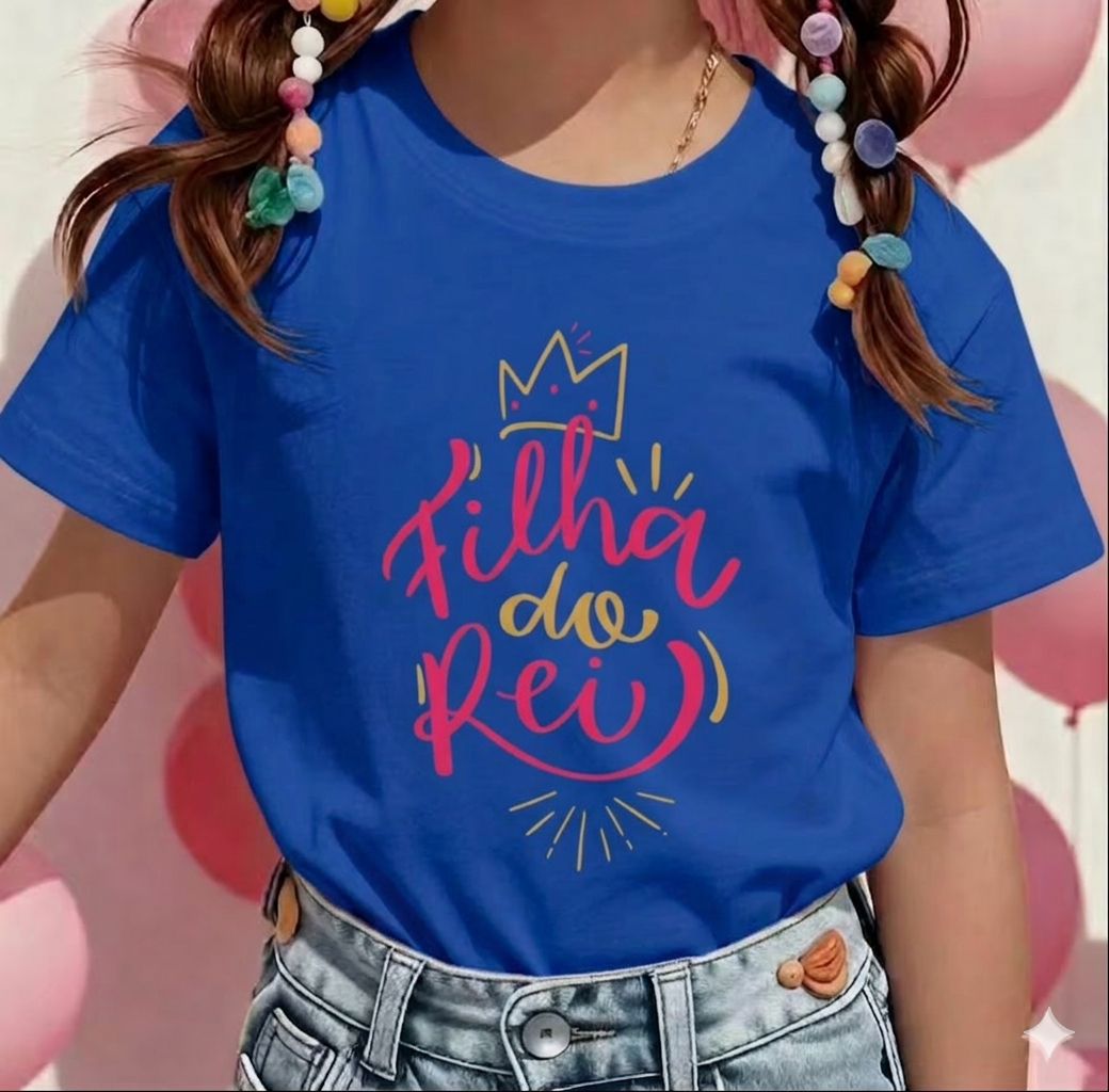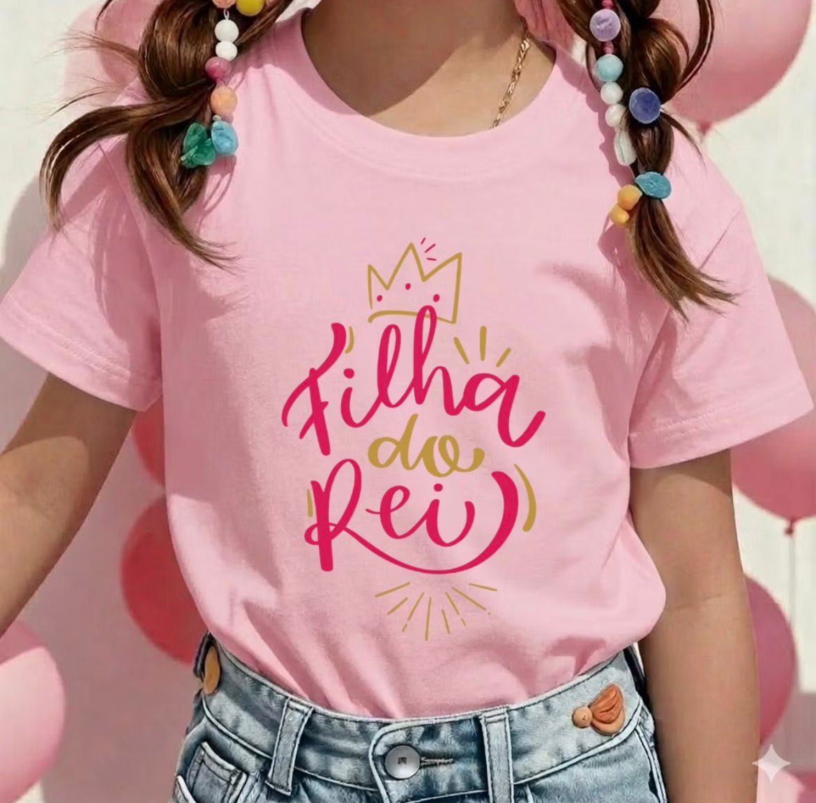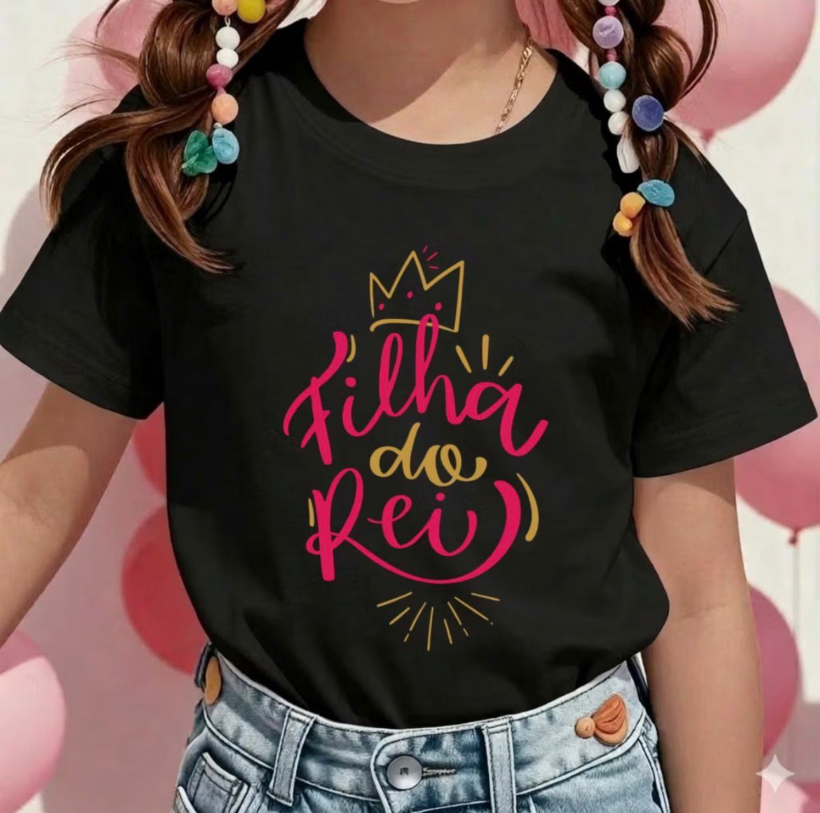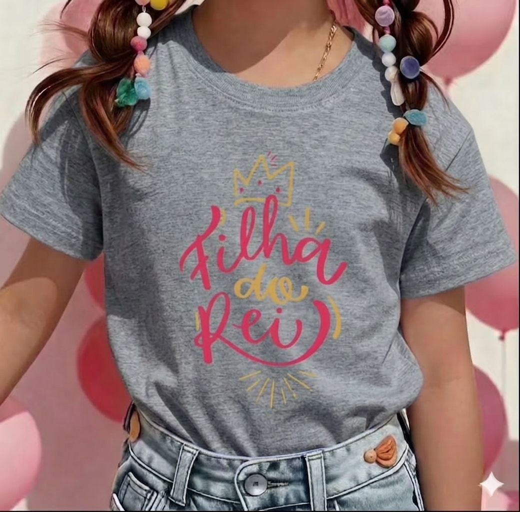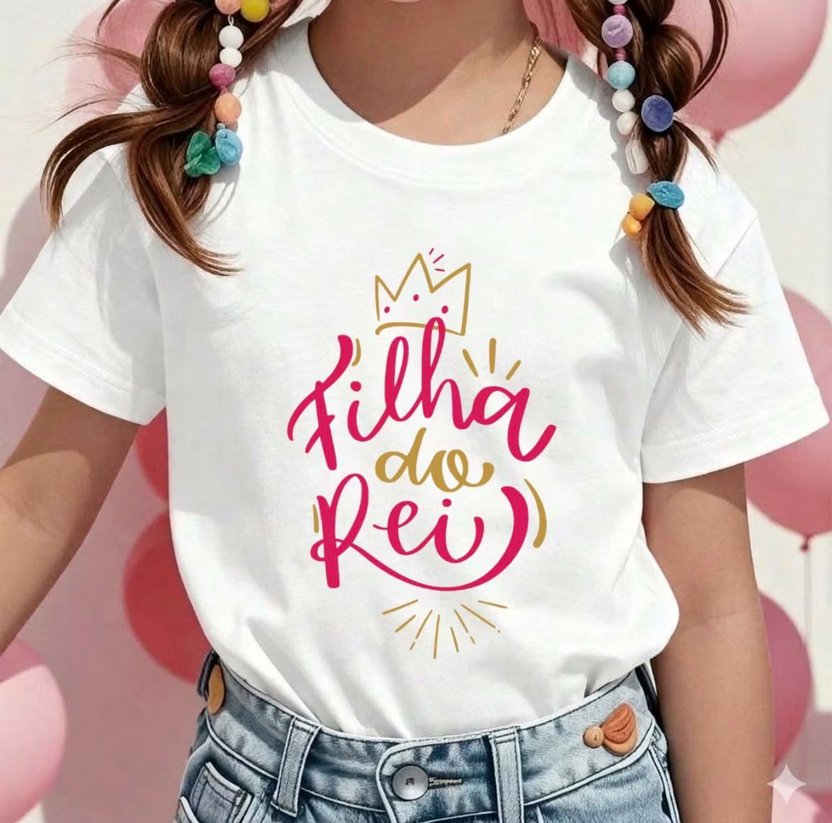 Deixe sua pequena expressar a fé com estilo e muita fofura! Nossa T-shirt "Filha do Rei" combina um design moderno com uma mensagem especial, perfeita para ir ao culto, eventos da igreja ou para o dia a dia com muito charme.
